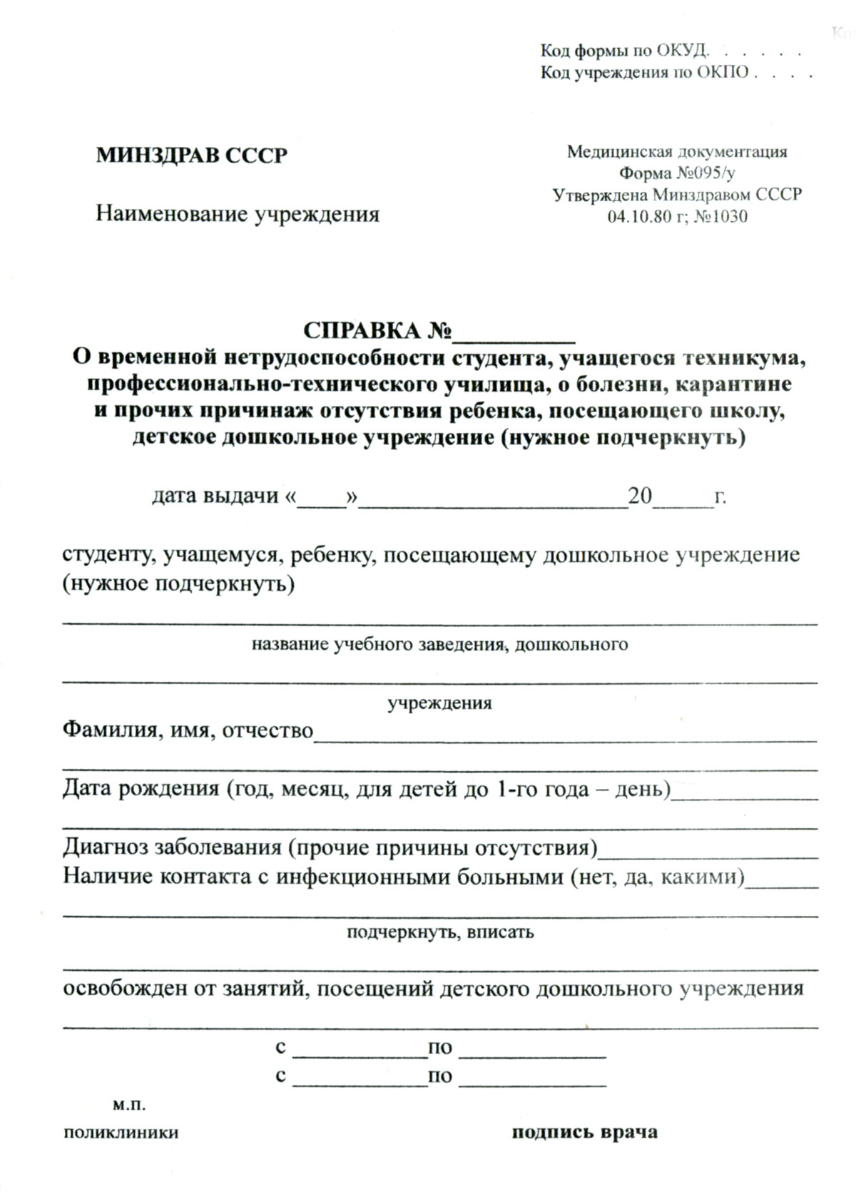 Медицинская справка формы 095/у (подтверждение нетрудоспособности)